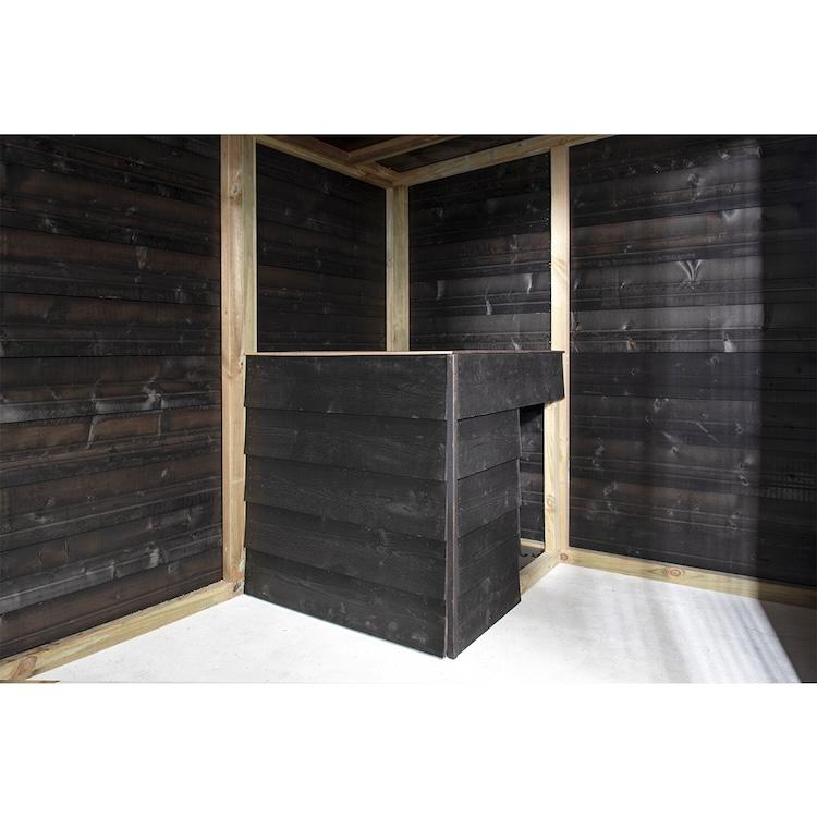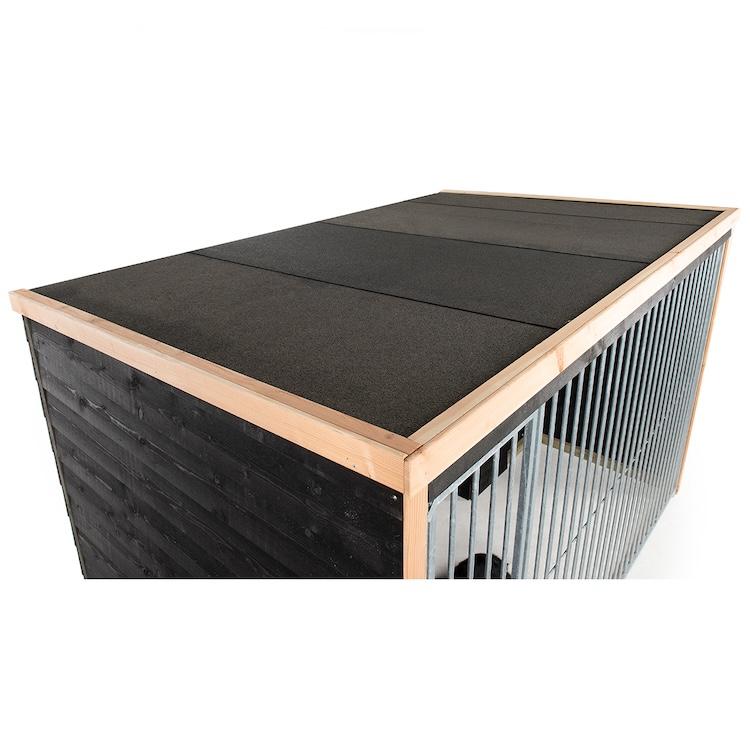 Een deel van het voorpaneel is gesloten, waardoor er een windvrije hoek ontstaat in de kennel. Hier is het nachthok geplaatst, dat eveneens is afgewerkt met zwarte potdekseldelen. De bodem van het nachthok is gemaakt van betonplex en biedt bescherming tegen optrekkend vocht en koude ondergrond.
