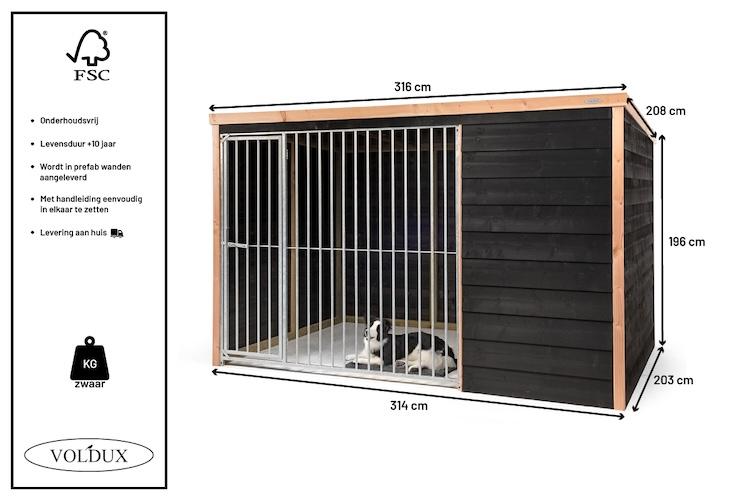 Hondenkennel Rex is een luxe, handgemaakt buitenverblijf met een landelijke uitstraling dankzij zwarte potdekseldelen. Deze onderhoudsvrije kennel is gemaakt van duurzaam hout, voorzien van een nachthok met betonplex bodem en biedt jouw hond comfort, veiligheid en bescherming in alle seizoenen.